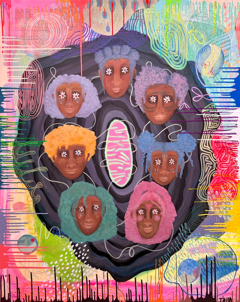 (Paying homage to mitochondrial mutha! Transmuting pain into joy, reclaiming innocence and childlike fun, extending gratitude and healing seven generations forward and back. Each eye flower has seven petals on the seven characters overlaying female anatomy of seven layers, centered around a mitochondrion (where resilient DNA is contained, inherited solely from mother).)