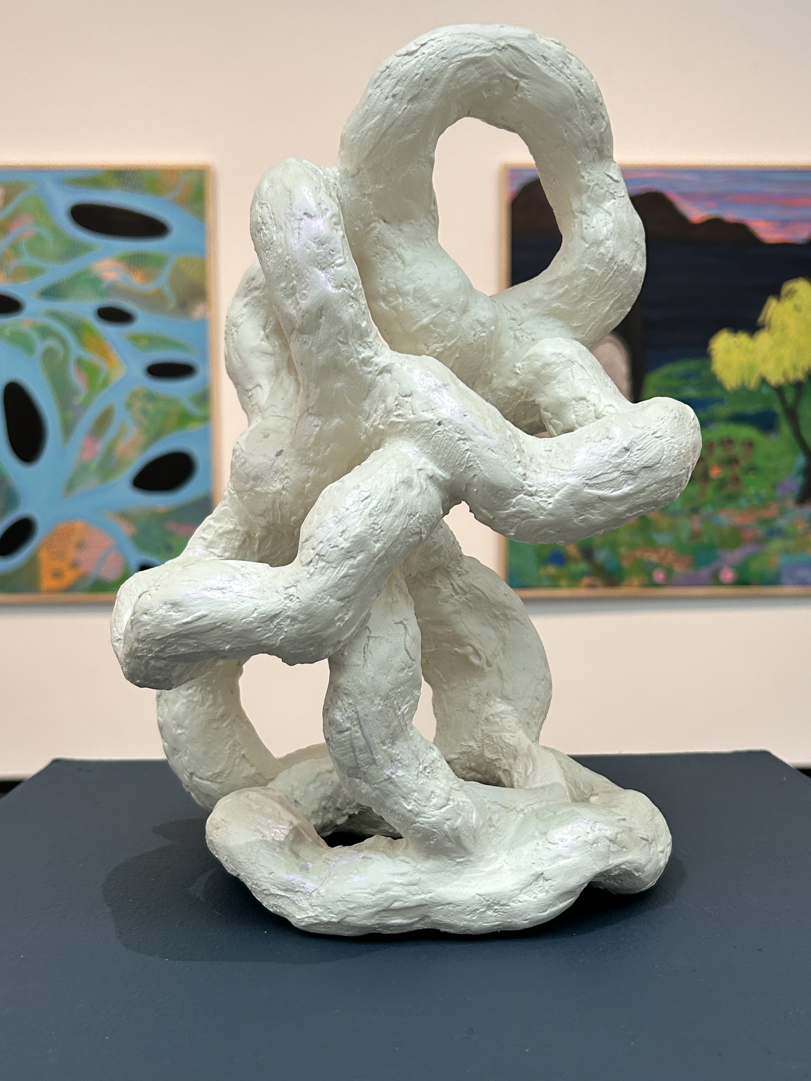 clay sculpture complementing the painting ‘Ke Akua’ as seen in the background
